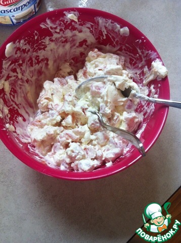 Итак! Семгу порезать на кубики где-то 0,5 мм и выложить в миску с маскропоне