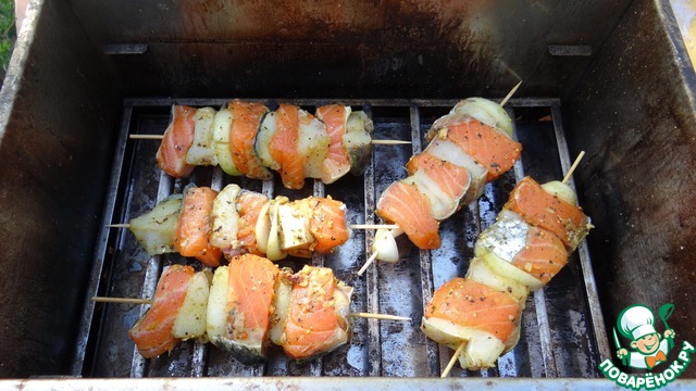 Нанизать рыбу поочередно на шпажки, не забывая про лук;