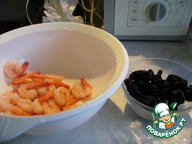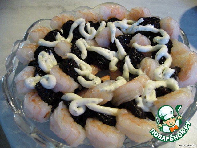Нафаршировать чернослив креветками, красиво уложить на блюдо.