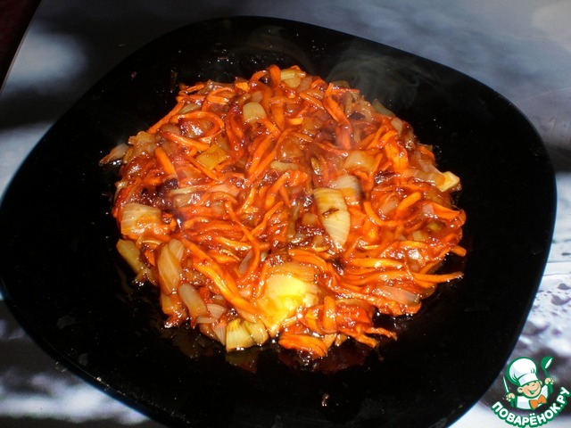 Лук нарезать мелко, морковь натереть. Обжарить на растительном масле до мягкости, затем добавить наш соус и протушить 5 минут, помешивая.