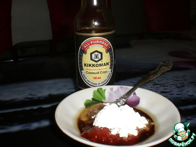 Приготовить соус в азиатском стиле: смешать 6 ч. л. соевого соуса Kikkoman, 2 ч. л. растительного масла,2 ч. л. томатной пасты, 1 ч. л. сахара и пол чайной ложки крахмала.