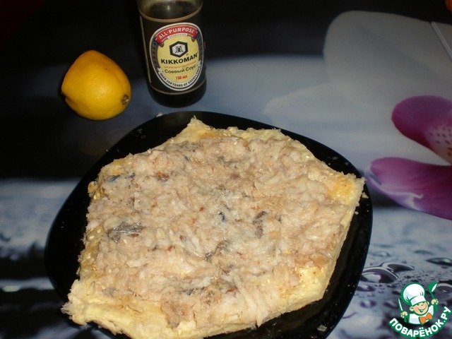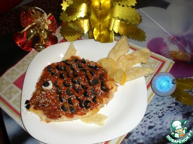 Выложить рыбу на лепешку из теста, обрезать края. иметь в виду, что будем придавать форму рыбы