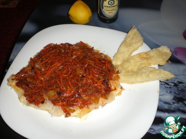 | Рыба под маринадом - любимое в нашей семье блюдо. Я попробовала придать ему азиатский колорит при помощи кунжута, соевого соуса Kikkoman с сахаром, крахмалом и томатом для тушения овощей, а еще уложила рыбку на воздушное слоеное тесто. Получилось очень вкусно и празднично! |