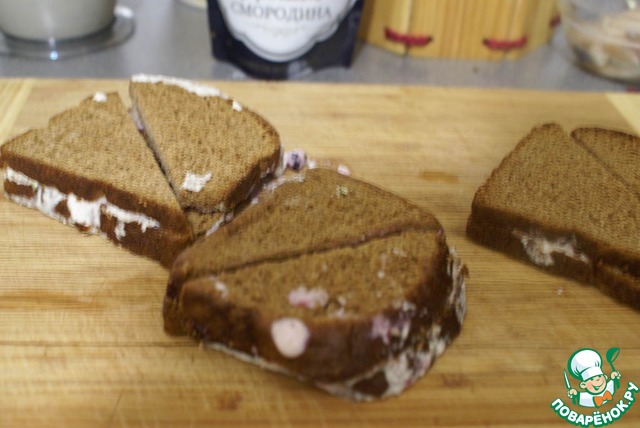 Сложить ломтики хлеба как "сендвич". И разрезать по диагонали.