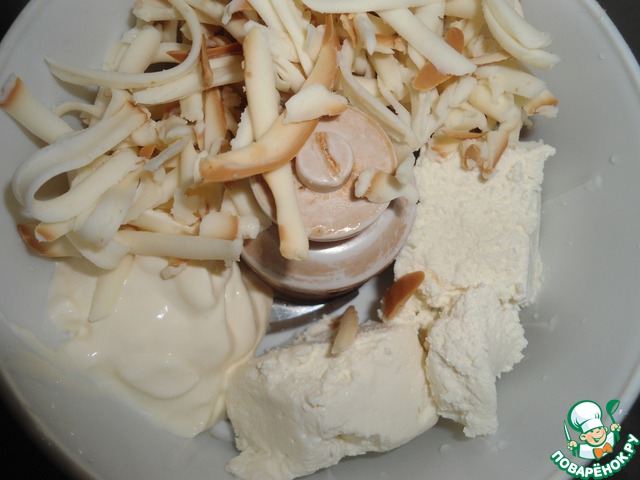 В блендер помещаем сыр, творог и сметану. Измельчаем.