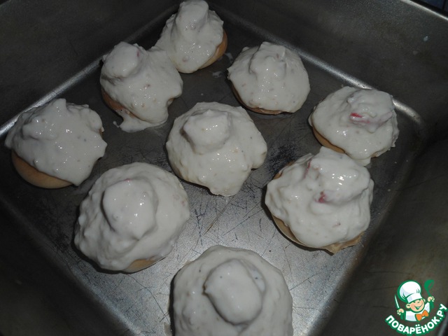 Сверху обмазываем творожно-сырным кремом. Отправляем крабовые домики в духовку на 30 минут при Т +180 градусов.
