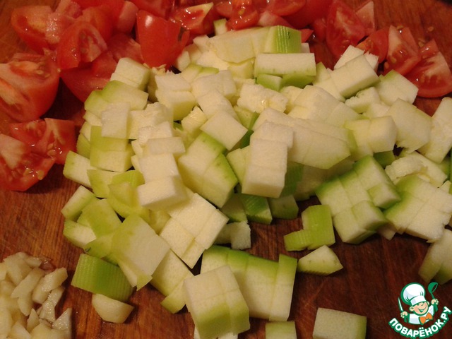 Кабачок нарезаем на кубики и помидоры, чеснок мелко измельчаем, чеснок обжариваем на растительном масле, далее обжариваем и помидоры, солим, перчим.