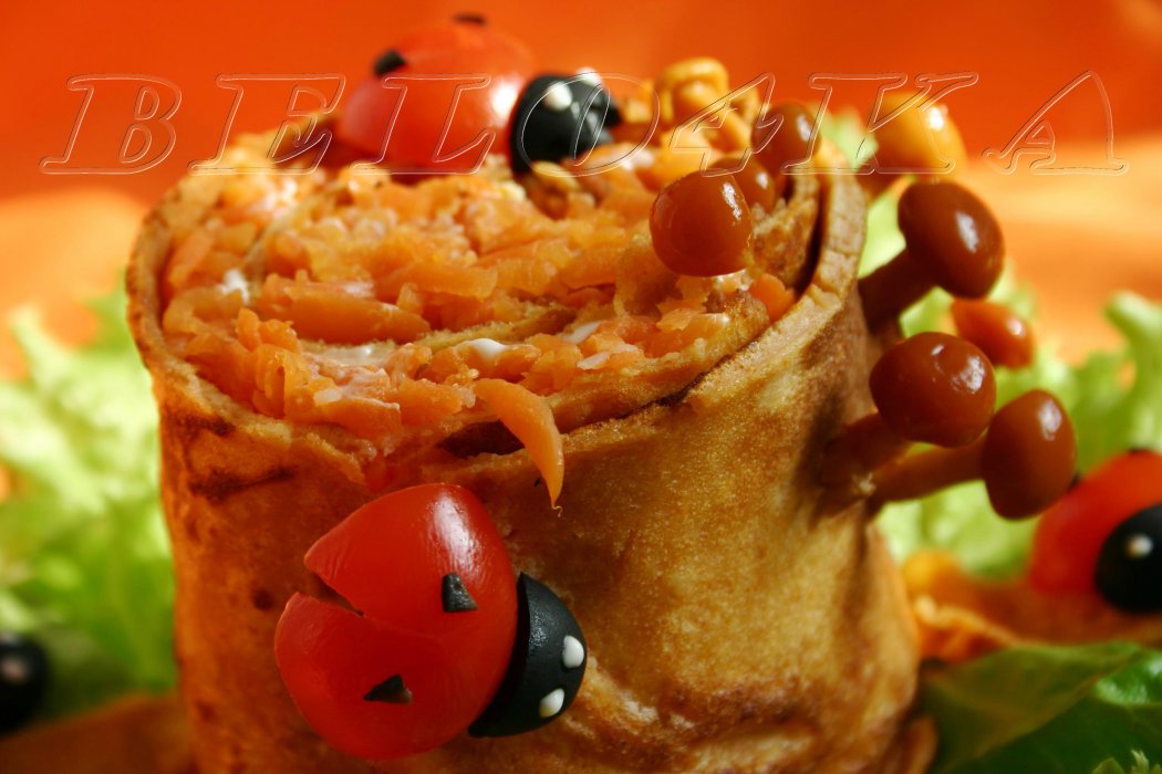 Теперь аккуратно, но плотно скатываем блины в рулет. Получившийся рулет выкладываем на блюдо морковным слоем вверх. Если на блюде неаккуратно торчат края блинов, их можно подрезать. Собственно, пенек готов. Остальное - дело фантазии. Мой растет на травке (листовой салат), корни - из обрезков блинов, опята я посадила, сделав в пеньке дырочки ножом (если грибочки не хотят держаться, можно посадить их на зубочистки, но предупредить всех участвующих в трапезе),