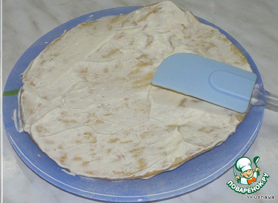 Каждый корж обмазать с 2-х сторон смесью сметаны и майонеза.