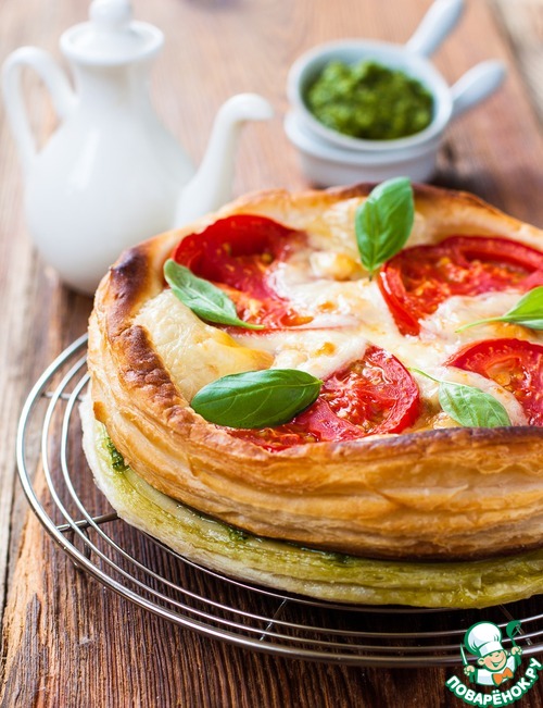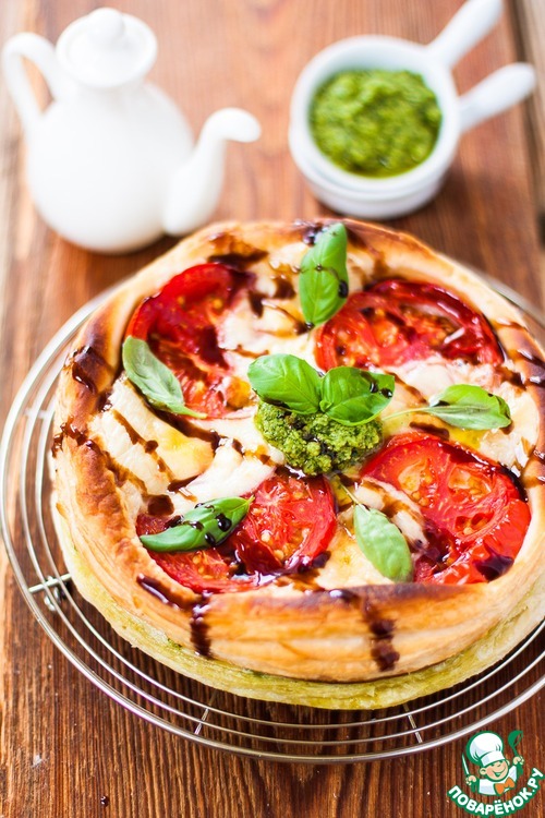 | Это моя импровизация. Закусочные торты - совершенно новая и незнакомая мне тема, с какой стороны к ним подступиться, не знала. Поэтому решила совместить в этом рецепте все, что люблю - сочные помидоры, хрустящее слоеное тесто, пикантный соевый соус, тягучую моцареллу и ароматный соус песто. Получилось превосходно! Заношу рецепт в любимчики под меткой - просто и со вкусом)) |