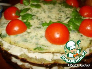 Затем снова слой из картофельного блинчика, майонез, помидоры. И последний слой из омлетного блинчика. Украсила половинками помидора - черри и зеленью.