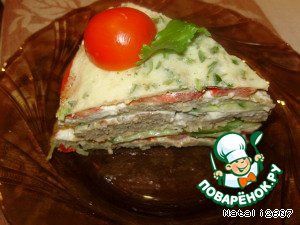 | Состоит из трех видов блинчиков мясного, картофельного и из омлета. Между ними прослойки из свежих овощей. Необычно и вкусно! |
