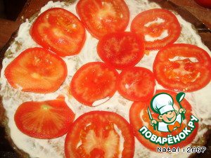 Собираем торт: 1-й слой из картофельного блина, обмазать майонезом его, сверху выкладываем нарезанные тонко помидоры.
