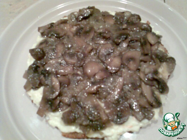 Сверху выкладываем часть грибов, снова корж, соус, грибы, сверху корж.