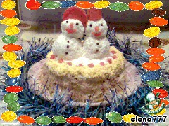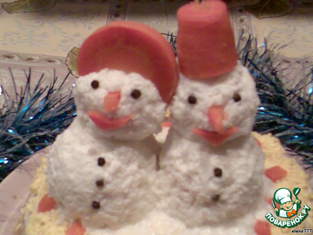 Белки трёх яиц так-же натереть на мелкой тёрке, шарики обвалять в майонезе, затем в белках. Скрепить зубочисткой большой и маленький шарики. Сделать два снеговичка и поставить на торт, край которого я посыпала одним тёртым желтком. Приделываем снеговичкам глазки-горошины чёрного перца, носики, ведёрко и кокошник из морковки.