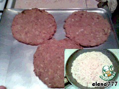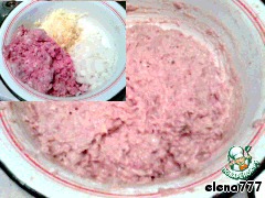 Делаем коржи: в фарш положить мелко порезанный лук, 1 яйцо, кабачок, натёртый на крупной тёрке, посолить, поперчить, хорошо перемешать, слегка взбивая рукой. Добавить муку и тщательно вымесить.