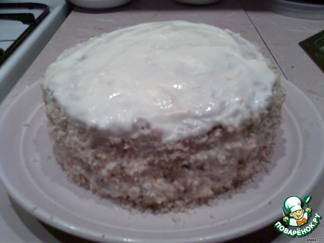 Обмазать весь тортик - бока и верх соусом. Бока обсыпать тёртыми грецкими орехами.