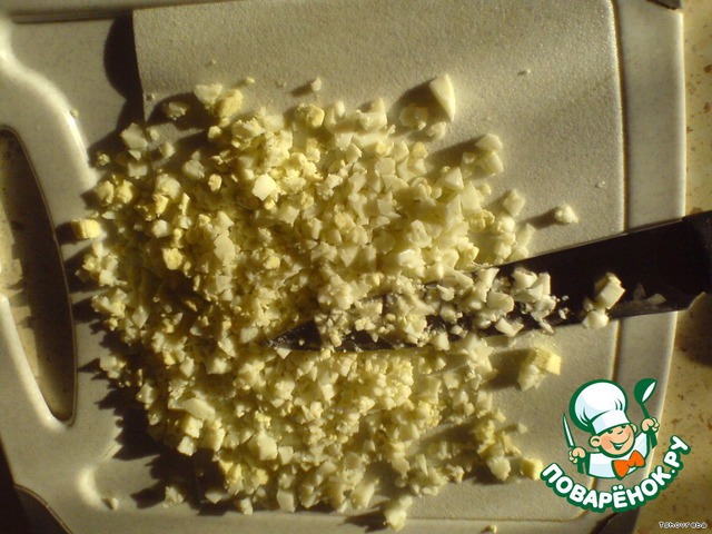 2. Яйца отварить вкрутую, остудить, мелко порубить,перемешать с майонезом, пока отставить в сторону.