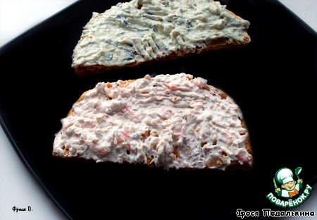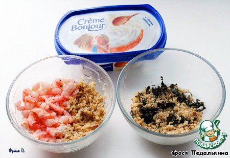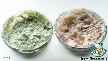 Добавить в каждую начинку по 50 гр сливочного сыра и по 3 ст.л. сметаны, перемешать.