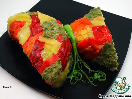 Перцы очистить от семян, порезать на ромбики, слегка отбить с внутренней стороны.