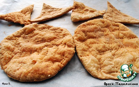 Выпекаем слоеные коржи: тесто размораживаем, тонко раскатываем, слегка присыпав мукой, вырезаем 2 круга и 4 треугольника.