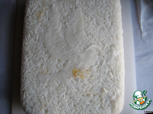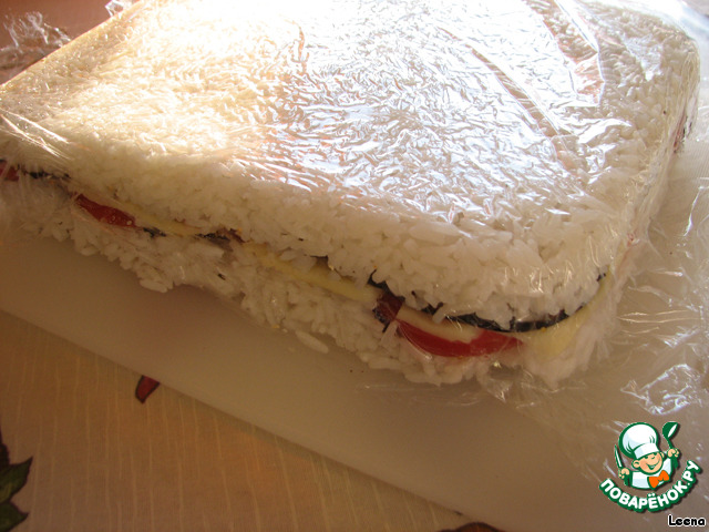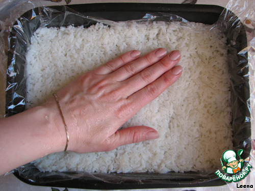 Его нужно сварить и еще теплым уложить в форму, простеленную пищевой пленкой. Затем уплотнить рукой, чтобы рисинки между собой склеились.