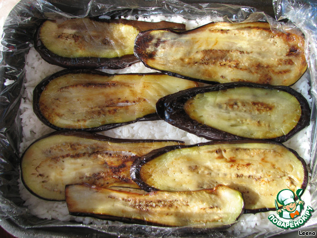 Спустя 15 минут ломтики баклажана моем, высушиваем полотенцем и жарим на растительном масле до румяности. Жаренные ломтики укладываем на рис.