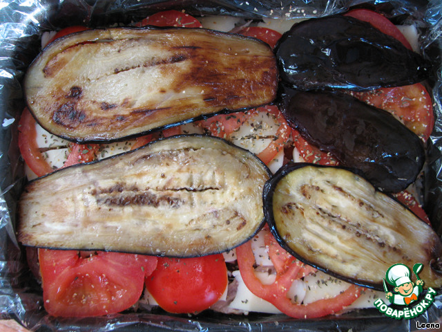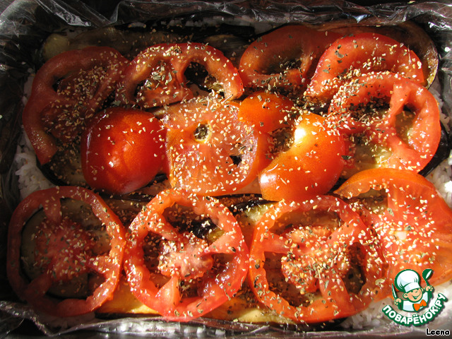 И теперь все повторяем в обратной последовательности: помидоры, баклажаны, а сверху рис.