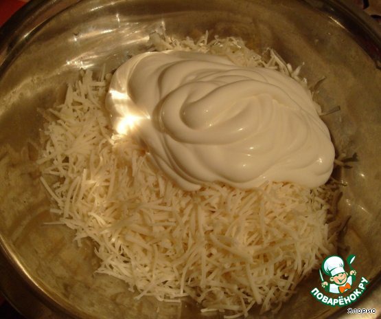 3. Сырный крем - два стакано мелко натертого сыра смешиваем с майонезом и тертым чесноком. В зависимости от сорта сыра, крем можно по вкусу подсолить.