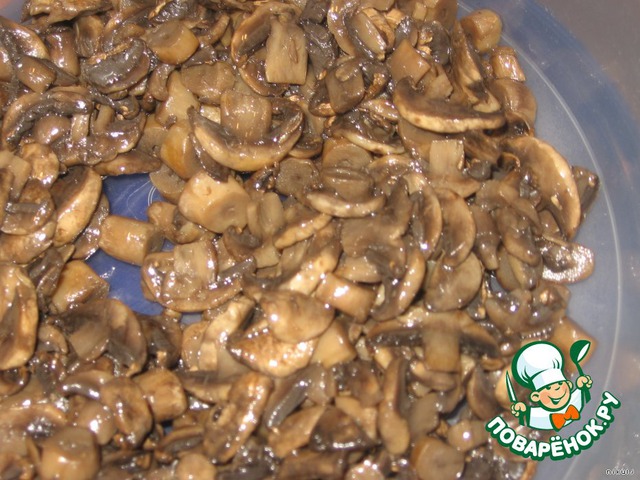 Грибы (шампиньоны) порезала тонкими ломтиками, обжарила на растительном масле (можно добавлять лук и морковь по желанию).