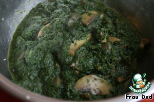 Шпинат и грибы обжарить на сковороде. Если используете свежие продукты - обжаривать не более 5 минут, посолить. Если замороженные, то пока не выпарится жидкость и после этого - 5 минут. Дать оставшемуся соку стечь на дуршлаге.