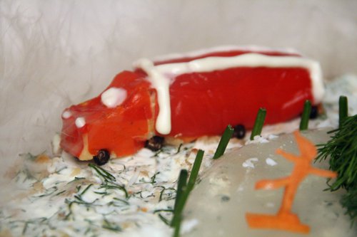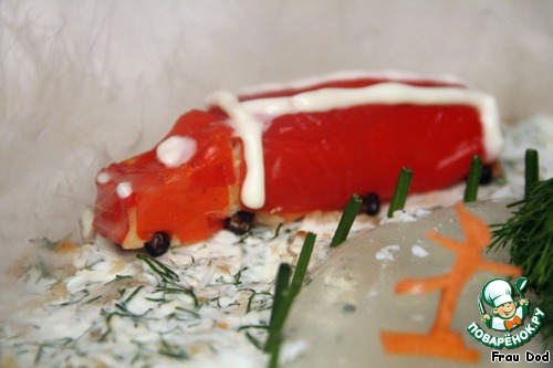 Собираем торт. Нижний корж промазываем половиной творожной смеси, сверху укладываем тонко нарезанную семгу.