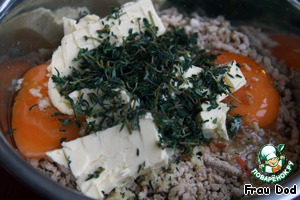 Добавить яйца, сливочное масло, рубленый тимьян, раздавленный чеснок, все тщательно перемешать.