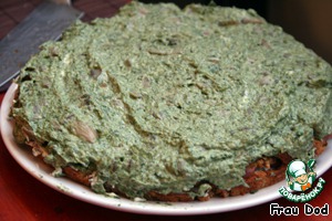 Накрываем вторым коржом, на который выкладываем грибы со шпинатом.