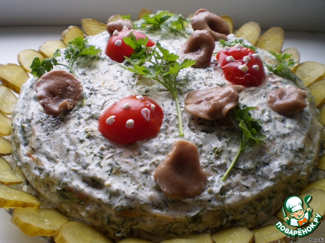 Украсить сверху, помидорками, маринованными грибочками, листиками петрушки. Приятного аппетита!!!