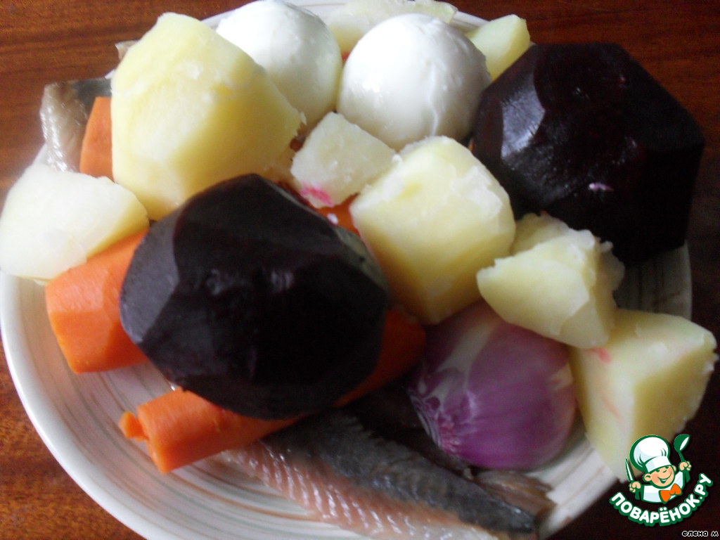 Подготовленные сельдь, свеклу, картофель, морковь, яйца, лук