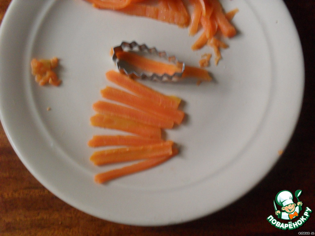 выложить кругом, серединку сделать из размятой моркови и яичного белка или желтка.