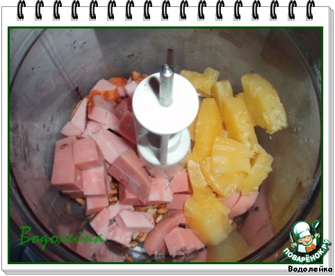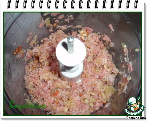 Готовим нашу начинку. Берем ветчину, ананасы и орехи и измельчаем в блендере. Но только измельчаем, а не доводим до состояния пюре.