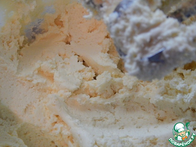 Добавляем размягченное масло и сливки. Перемешиваем миксером на малых оборотах.