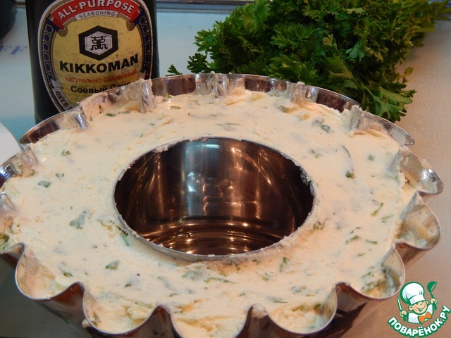 Чтобы места для грибов было больше, я вставила в форму кулинарное кольцо. Вот так. Заполненную форму убираем в холодильник часа на 2.
