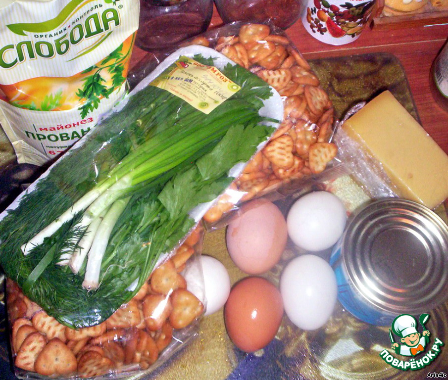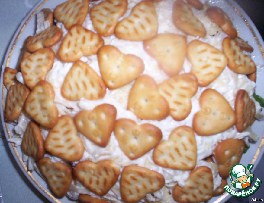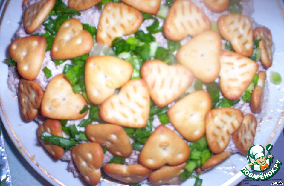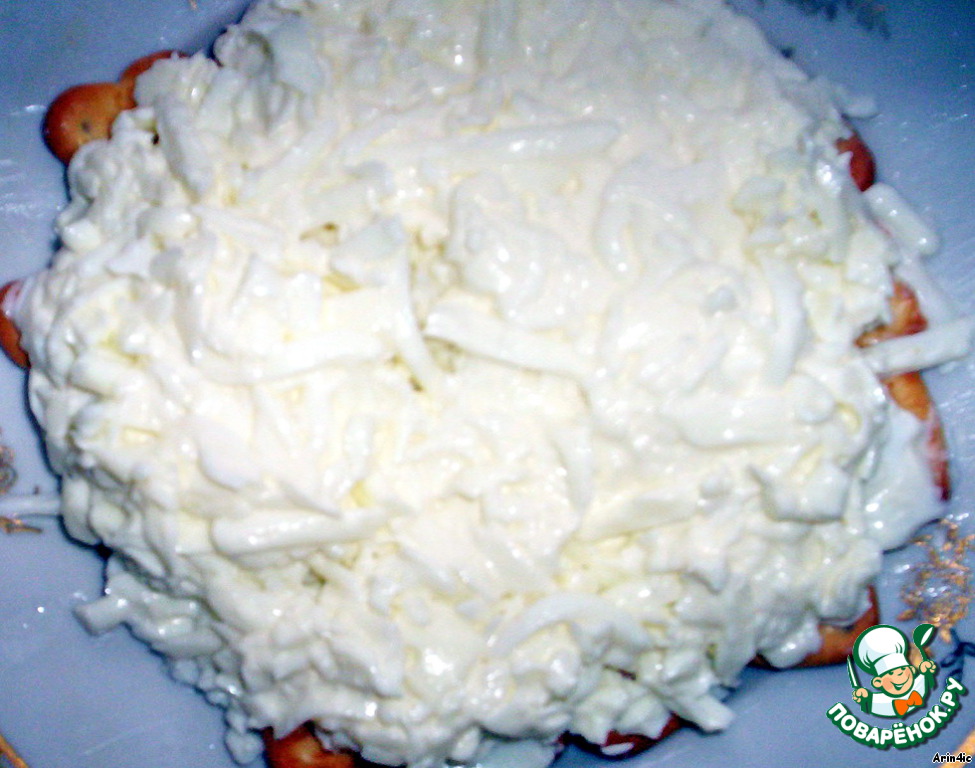3 слой - крекеры (старайтесь выкладывать их как можно плотнее). Слегка смажьте майонезом.