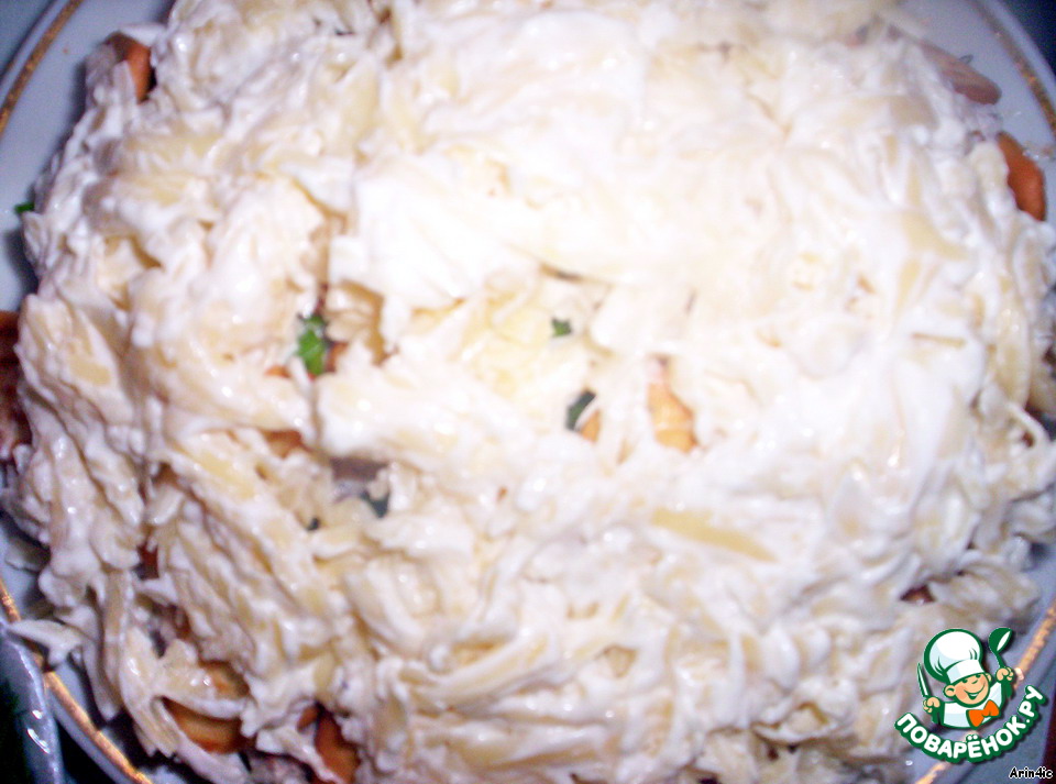 7 слой - сыр и чеснок натереть на терке и смешать с майонезом.