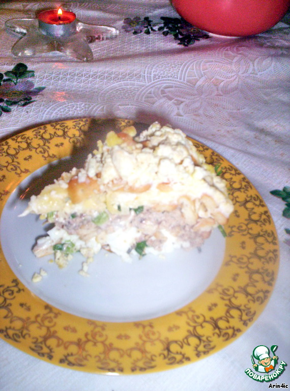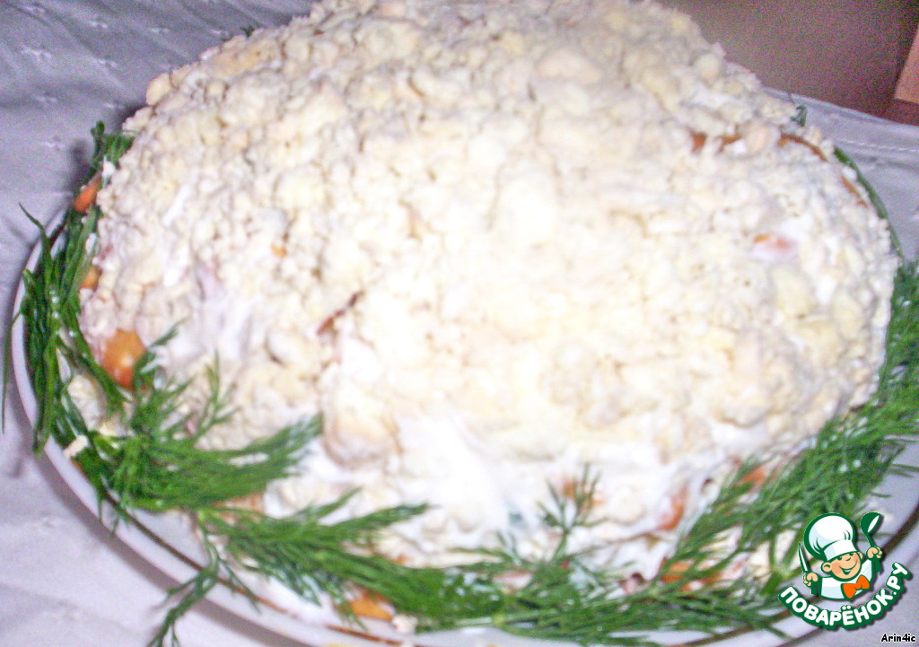 | Поздравляю всех дорогих поварят с наступающим Новым годом! Хочу подарить рецепт вкусного тора-салата. Среди моих гостей этот салат вызвал фурор, к удивлению, никто точно не смог определить его состав, но понравился всем, без исключения! Даже моя мама попросила рецептик, хотя обычно рецептами не интересуется. Рецепт с сайта супер кук. |