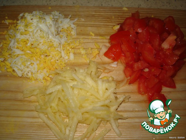 Уложить на блюдо, сверху мелко порезанный помидор, потертое яблоко и яйца, пропитать сметаной, ножом сделать квадратики, присыпать горчицей, создавая вид поля для игры.