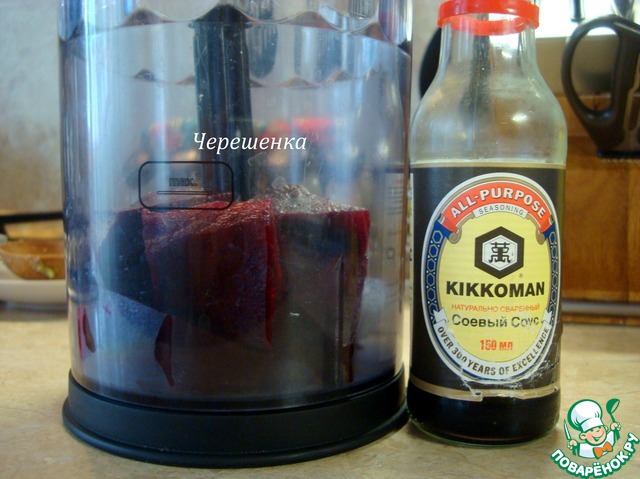 Свеклу очистить, порезать на кусочки. Вместе с соевым соусом, овощным бульоном, чесноком и прованскими травами взбить в пюре в блендере.