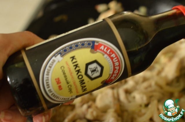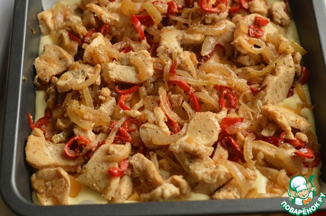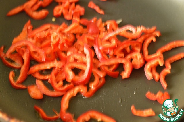 1. Лук нарезать четвертинками колец, перец соломкой, курицу небольшими полосками. В сковороде разогреть ложку масла, обжарить перец.