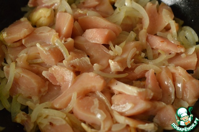 2. В другой сковороде разогреть ложку масла обжарить лук до прозрачности, добавить курицу, обжаривать. пока курица не станет белого цвета.