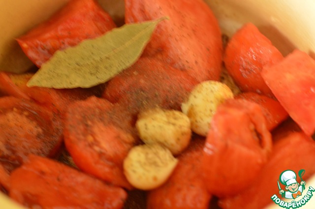 7. С помидор снять кожицу, нарезать крупно, переложить в сотейник. Добавить чеснок, сахар, соевый соус, бальзамический уксус, перец и лавровый лист. Тушить на медленном огне, пока соус не загустеет, потом протереть через сито.