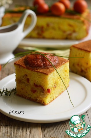 | Нежный, с ярко выраженным вкусом курицы и овощей закусочный торт. И томатный соус здесь очень кстати. |