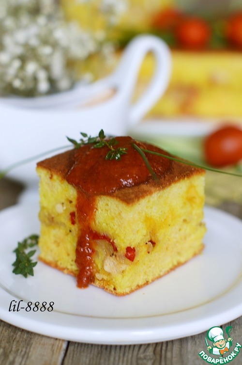 Закусочный бисквит без яиц с курицей, овощами и томатным соусом